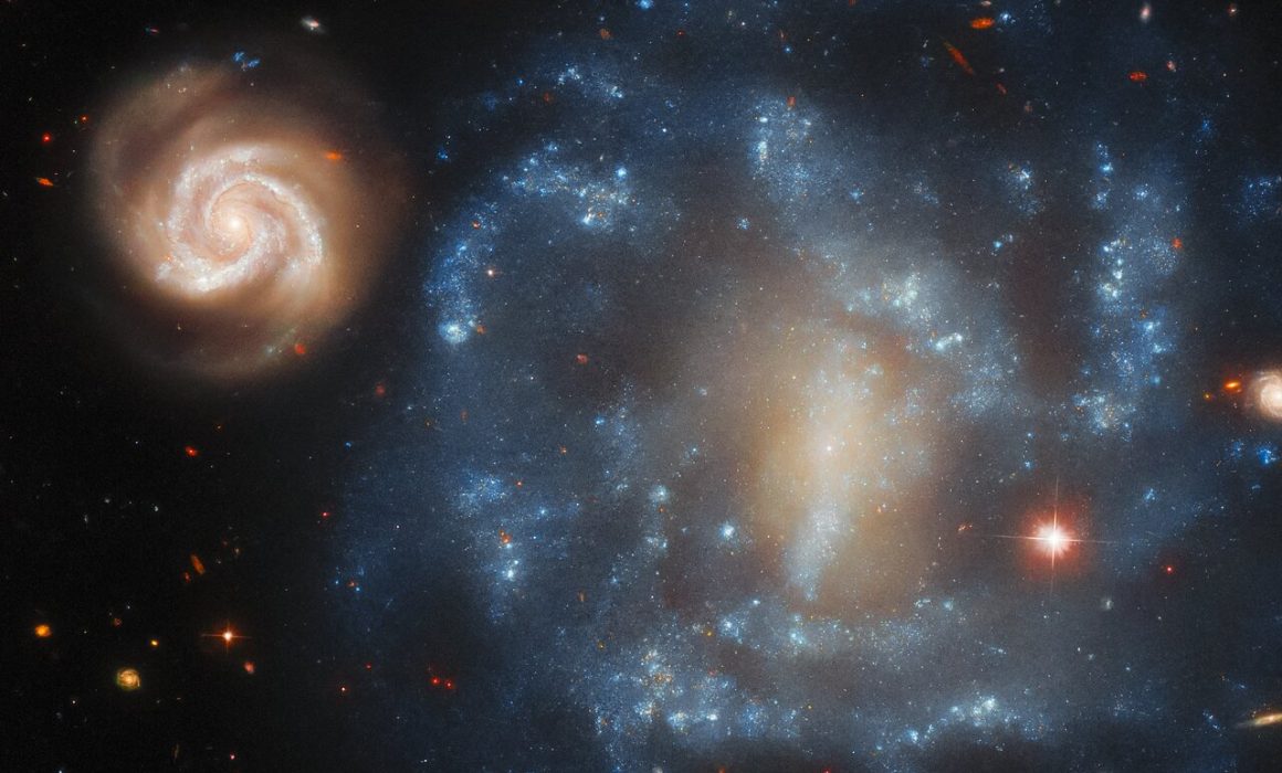 You have a large, somewhat ghostly blue spiral galaxy, and on its right shoulder sits a smaller, much brighter and more energetic spiral. Now, from our perspective on earth, they look like a pair of best friends traveling through the void together, but as we often say, in both astrophysics and retirement planning, looks can be deceiving.